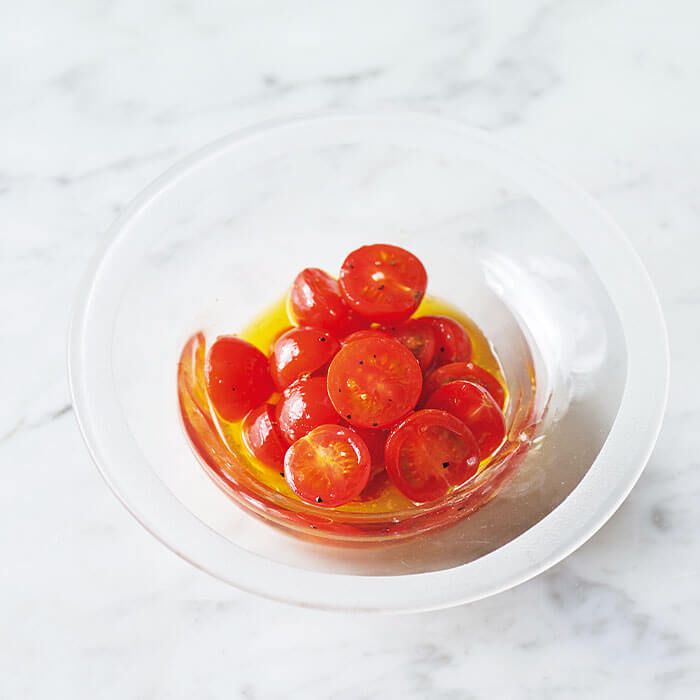 ボウルにⒶを入れて混ぜ合わせる。ミニトマトは横半分に切り、Ⓐと和える。