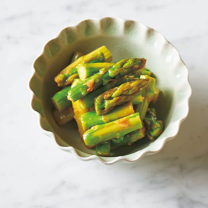 ②耐熱皿に水(分量外大さじ1)とアスパラガスを入れてラップをかけ、電子レンジで2分加熱する。水気をきり、ペーパータオルで水分を絞ってⒶと和える。