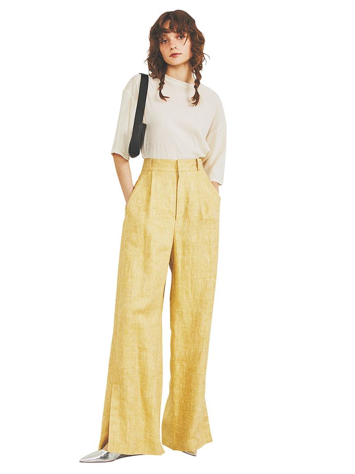 品のいい微光沢と手にとりやすい軽やかさを併せもつ、シルクリネンのワイドパンツ。素材の風合いが出るヘリンボーンの編地がフレッシュなイエローをとっつきやすくトーンダウン。幅広・直線フォルムで脚線をごまかし、足元のサイドスリットですっきりキレイに印象づけ。