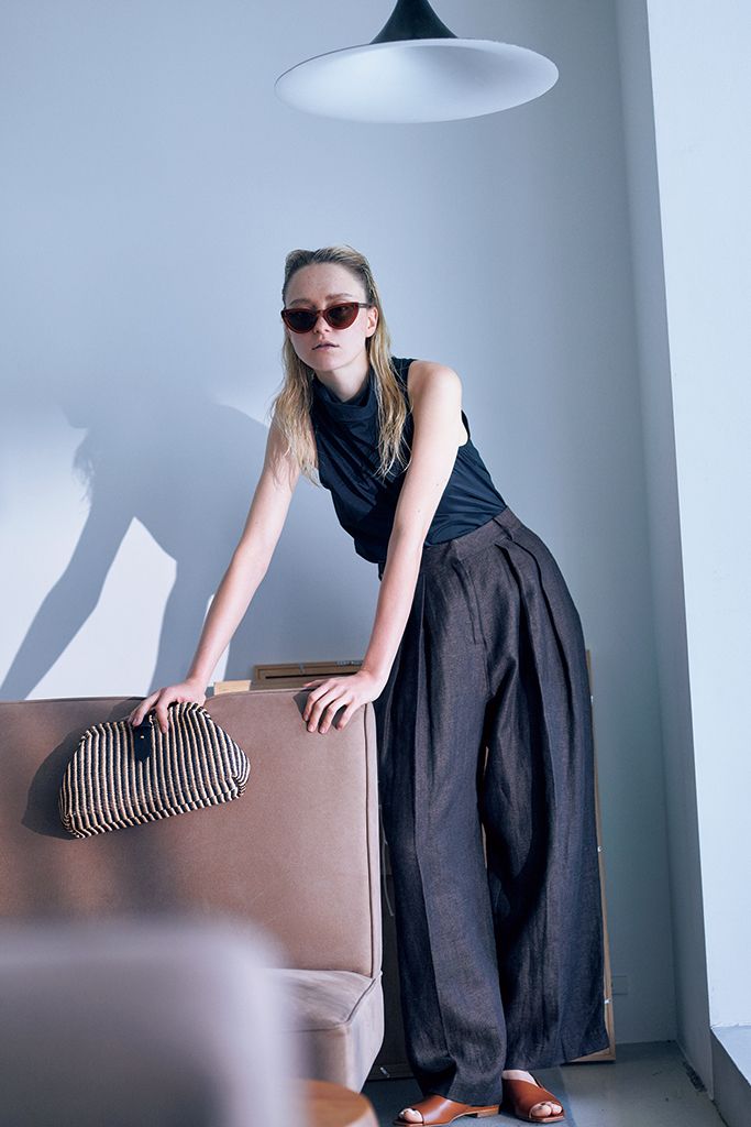 茶タックリネントラウザー、黒ハイネックノースリーブトップス/ともにTODAYFUL(Life’s 代官山店) サングラス/STATUS ANXIETY.(ジャック・オブ・オール・トレーズ プレスルーム) バッグ/カテリーナベルティーニ(プルミエ アロンディスモン) サンダル/PELLICO(アマン)