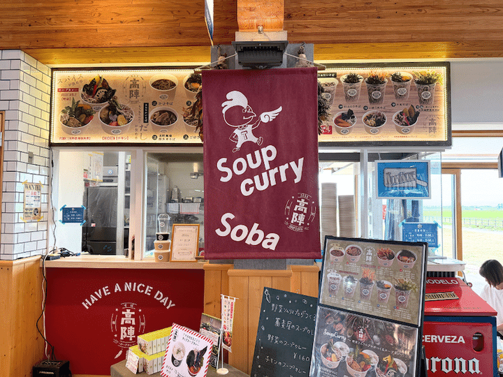 野菜ソムリエが考案した、当別町産の季節の野菜を使用したおいしいスープ、カップそばが味わえる「高陣 CUP STORE」。車の中でも食べられそうなカップ提供はドライバーに優しい設計です。
