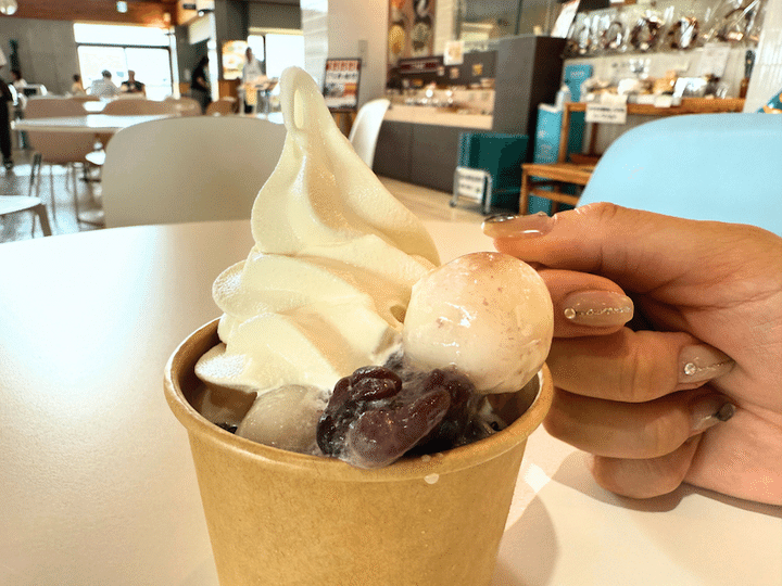 大きな白玉がゴロゴロと5つも入っていて、ソフトクリームとの相性も抜群!和にも洋にも合うのがソフトクリームの魅力ですね!