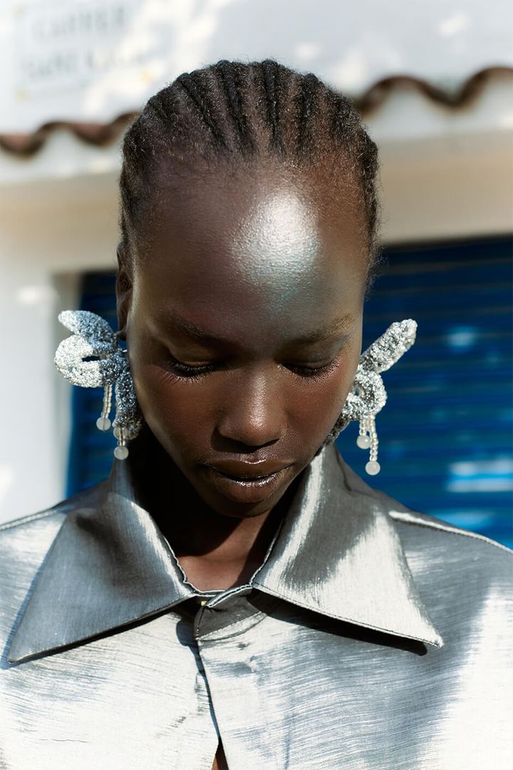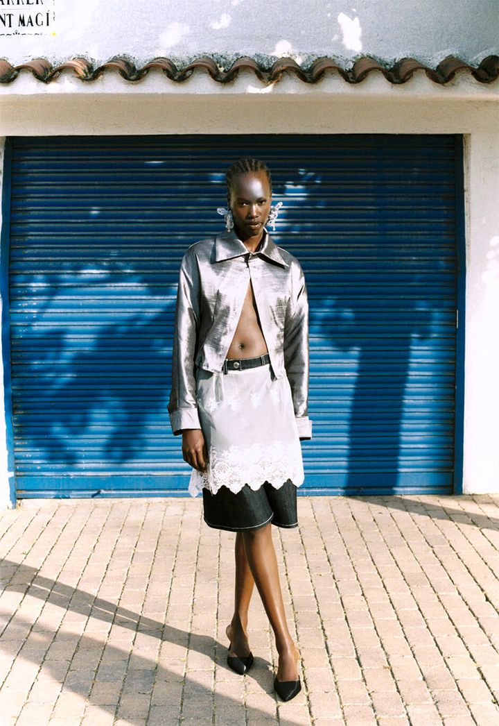jacket and earrings by CASA HELENE, skirt by IRO STUDIO, shoes stylist’s own