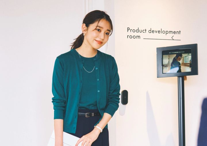 カーディガン¥2,990、クルーネックセーター[一部店舗のみで販売]¥1,990/ともにUNIQLO テーパードパンツ¥8,998/NATURAL BEAUTY BASIC リボン付きパンプス¥16,500/ダイアナ(ダイアナ 銀座本店) ベルト¥1,290、ネックレスセット¥590/ともにGU 時計¥93,500/ヴァンドーム青山(ヴァンドーム青山本店) メタルピアス¥4,290/AKTE