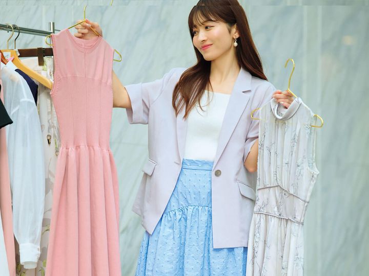 ジャケット¥6,996/ロペピクニック アンサンブル¥19,800/アプワイザー・リッシェ スカート¥15,400/Noëla パールイヤリング¥15,400/アビステ 手に持ったピンクワンピ―ス¥18,700/アプワイザー・リッシェ 手に持った花柄ワンピース¥17,600/MERCURYDUO(MERCURYDUO ルミネエスト新宿店)