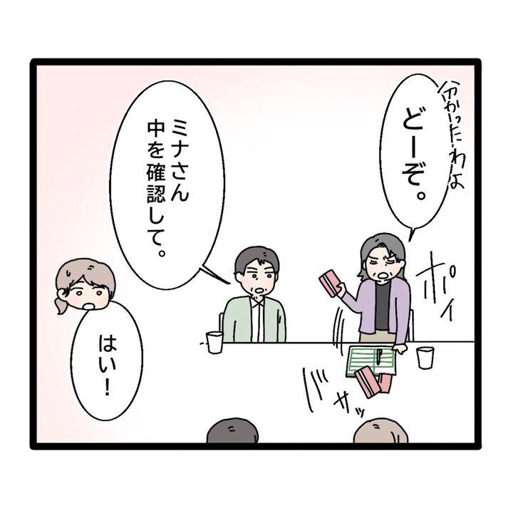 カバンから私の通帳を取り出し「分かったわよ。どーぞ。」と通帳を投げてきました。義父が「ミナさん中を確認して。」というので「はい!」と返事をし通帳を手に持ちました。