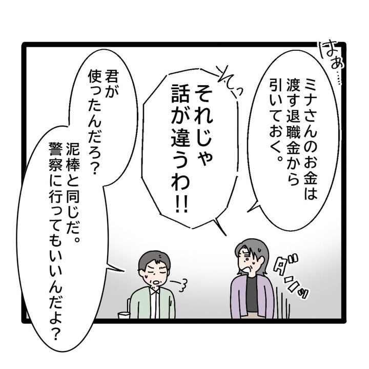 義父は大きなため息をついて「ミナさんのお金は渡す退職金から引いておく。」と言ってくれました。それを聞いた義母は勢いよく立ち上がり「そっそれじゃ話が違うわ!!」と大きな声を出しました。義父はさらに大きなため息をつき「君が使ったんだろ?泥棒と同じだ。警察に行ってもいいんだよ?」と言いました。『警察』という言葉を聞いて何も言えなくなってしまった義母。