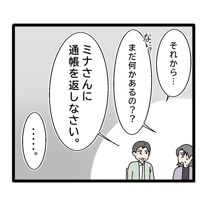 住んでいる家と義父の退職金の半分を貰うことを約束し、離婚届にハンコを押した義母。義父は離婚届にハンコを押したことを確認し「それから・・・」と言いました。義母が「なに?まだ何かあるの??」と聞き返すと「ミナさんに通帳を返しなさい。」と言ってくれました。それを聞いて黙り込む義母。