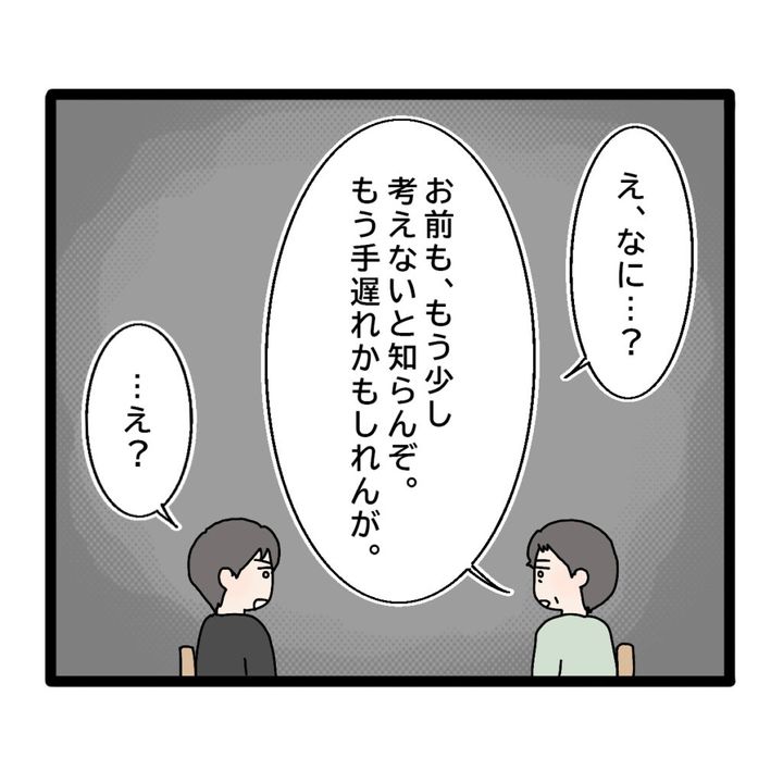 「え、なに・・・?」とキョトンとする伸介。義父は「お前も、もう少し考えないと知らんぞ。もう手遅れかもしれんが。」と言うと伸介は何のことか理解できず「・・・え?」と呟いたのでした。
