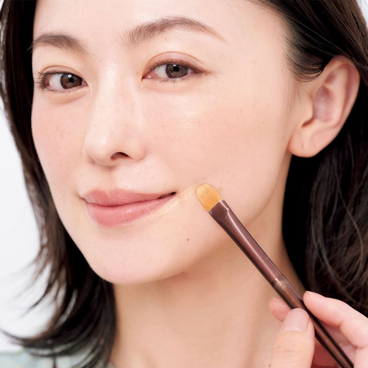 チークを含ませたブラシをティッシュの上でクルクルし、筆の中によくなじませてからオン。くすみやすい黒目下から、押しつけず軽くなぞるようにオン。頰がほんわり、元気な血色に!