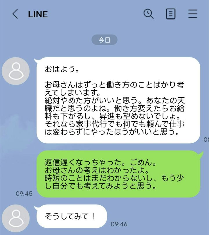 一昨日、育休復帰後の働き方を職場で時短がとれなかったら(仕事上時短がとれない可能性があり)、こういう働き方も考えているとチラッと話したら、今朝長文のLINEが入っていて、もうお母さんはずっとその事ばかり考えてしまいます。絶対やめた方がいい、おばあちゃんは昔~とかあなたはその仕事が天職だから~、家事代行でも頼んでやりくりを~などなど。