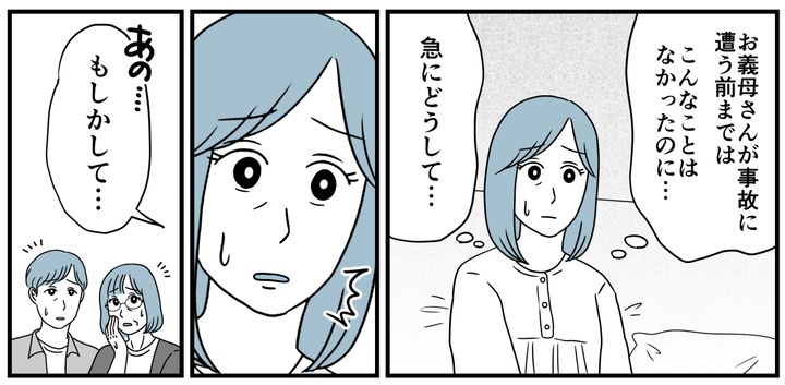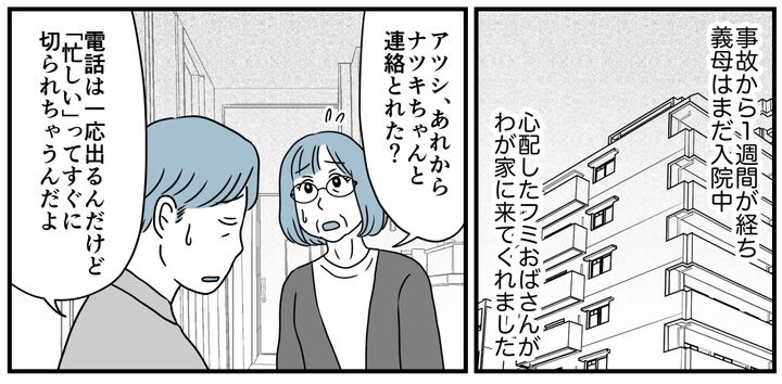 私(トモコ)は、夫のアツシと2人暮らし。40歳で結婚して現在妊娠7か月です。アツシはかつて引きこもっていた時期があるそうで、穏やかで人の痛みがわかる優しさがあります。義母や義妹のナツキさんは私たちの結婚にも妊娠報告にも喜んでくれました。しかしある日、義母が入院。知らせてくれたのは義母の妹・フミおばさんです。アツシは今後のことをナツキさんに相談しようとしますが、なぜかそっけなく電話を切られてしまって……?