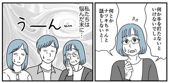 ナツキさんは少し離れた場所で、旦那さんと中学3年生の息子コウセイくんと暮らしています。アツシが電話してもすぐ切られてしまうそうです。私はこんな重大なことから逃げようとしているナツキさんの態度に納得できません。
