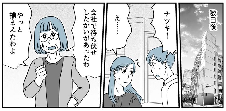 ナツキさんと直接話をしないことには始まりません。アツシとフミおばさん、そして私は3人で頭を悩ませ……。ナツキさんの仕事終わりの時間に会社の前で待ち伏せし、ようやくナツキさんを捕まえることに成功したのでした。