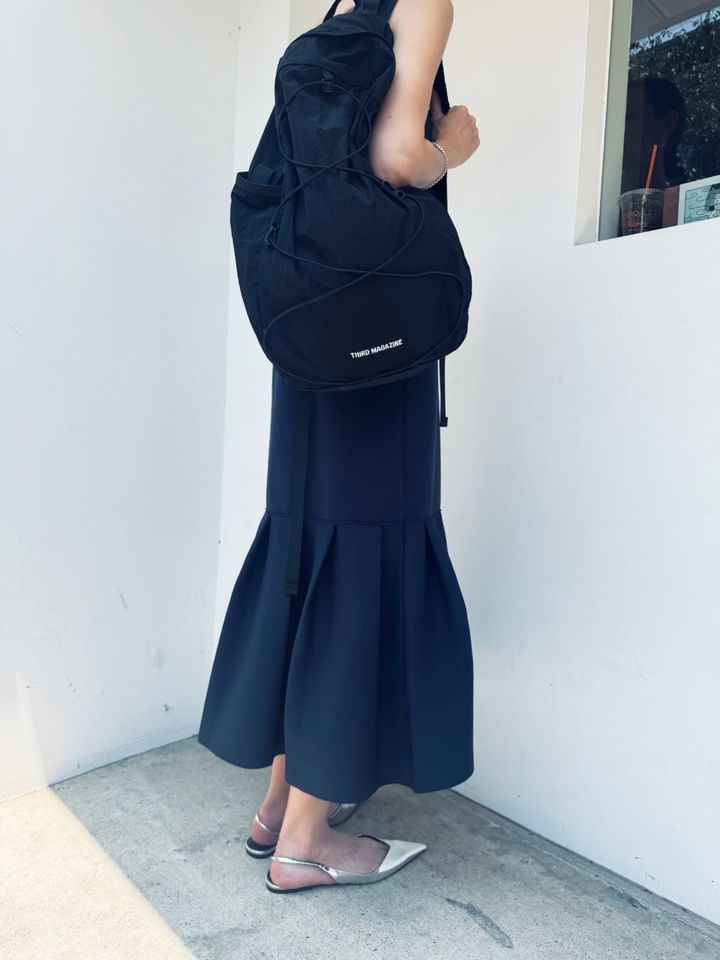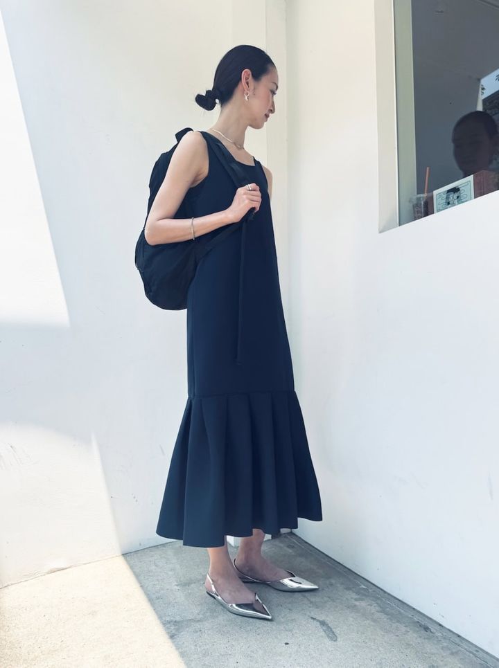 「上品なワンピースにバックパックを合わせてほどよくヌケ感のあるコーデを意識しました。アクセや小物はシルバーで揃えて、ミニマルなコーデにポイントをプラスしています」