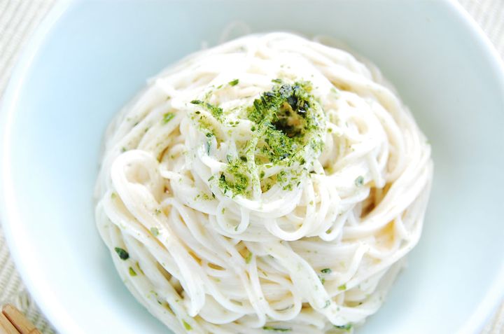 3. そうめんに、「これ!うま!!つゆ」、マヨネーズ、ガーリックパウダー、こしょう、青のりを加えて混ぜます。