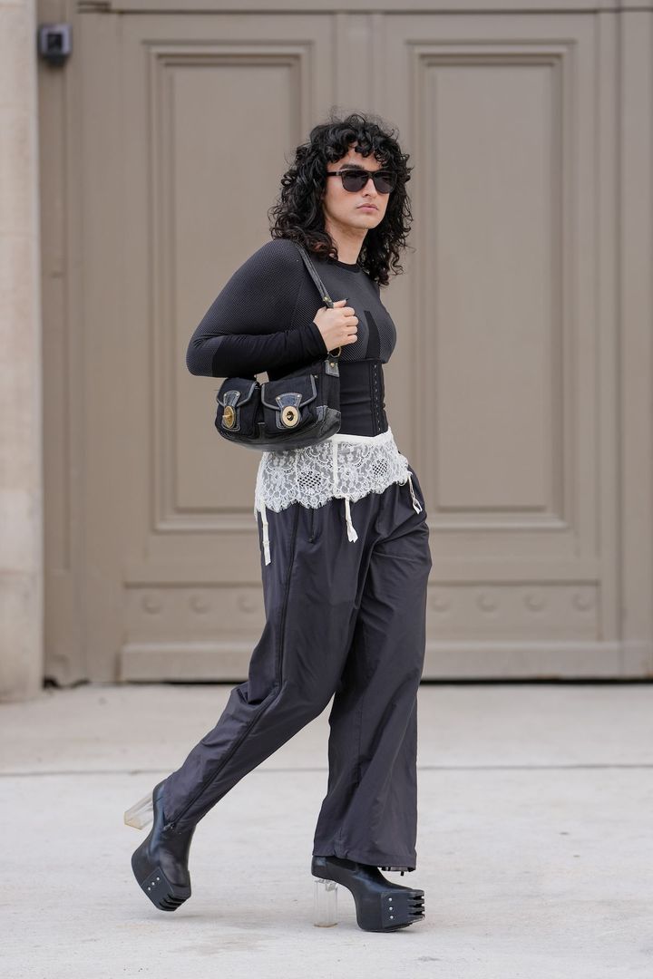 ストリートでは、レースのガーターベルトをオール黒のパンツコーデに合わせて、甘辛の絶妙なバランスを楽しんでいる上級者の姿も。