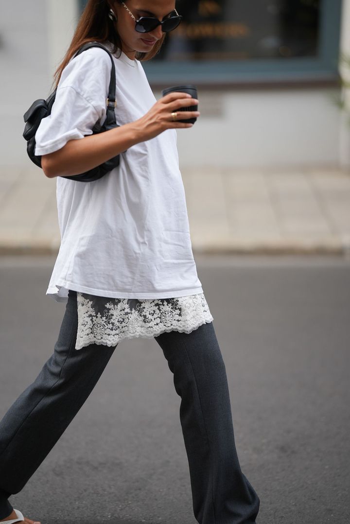 レースは必ずしも素肌に纏って透かす必要はない。例えば、夏の定番でもある白Tシャツに重ねて、裾からさらっと覗かせるだけで一気にオシャレ度が上がる。