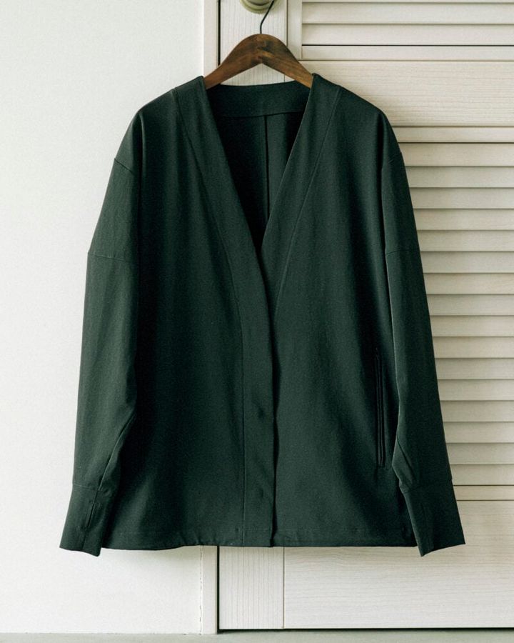 「軽く、バッグの中にさっと入れて持ち歩けるし、どんな服装にもマッチするノーカラージャケットはデイリーに重宝。UVカット、吸水速乾、ストレッチ性など頼れる機能がしっかり搭載されているのに、タウンユースできるデザインで優秀」