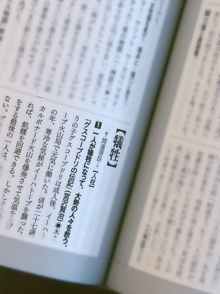 たとえば「犠牲」という要素に登場するのは、宮沢賢治の短編の一説から『ゴジラ』や『アルマゲドン』といったエンタメ作品、さらに『今昔物語集』のような歴史的古典や『失楽園』(ミルトン)といった海外の小説などなど、多彩な作品が紹介されています。