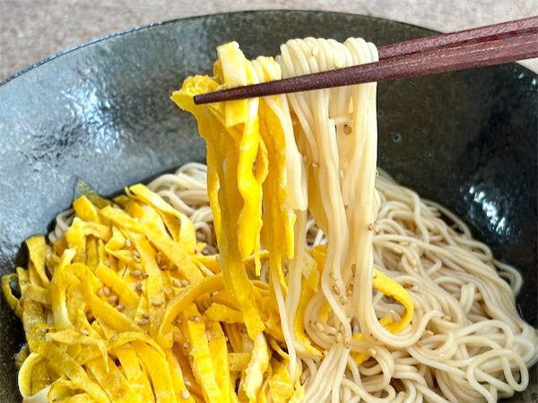 卵は薄いですが、パサつきがなくフタをして加熱したからか、しっとりしています。砂糖などの甘みを入れず塩のみなので、卵そのものの味が楽しめ、そうめんにもよく合い、白ゴマの香ばしさとともにおいしいです。細長い形状がそうめんとなじんで食べやすいですね。
