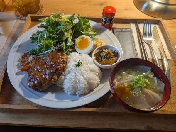 ふんわりやわらかハンバーグにペンネや洋風のかぼちゃの煮物、サラダなどが盛り付けられていて、ものすごくおいしい!!手作りだということが伝わってくる優しいお味です。この日は豚汁にしましたが、こちらも具だくさんで食べ応えがありました。読書の予定がなくても、ランチだけ食べに来たいと思えるほど絶品でした。