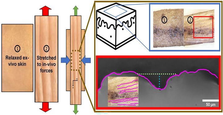 実験において皮膚のサンプルは、皮膚本来の張力を模倣した「一定の力」で40分間引っ張られ、どれくらい伸びるか(軸方向ひずみ)、横方向にどれくらい縮むか(横方向ひずみ)、どれほど体積が減少したか(収縮による液体の脱出) などが測定されました。
