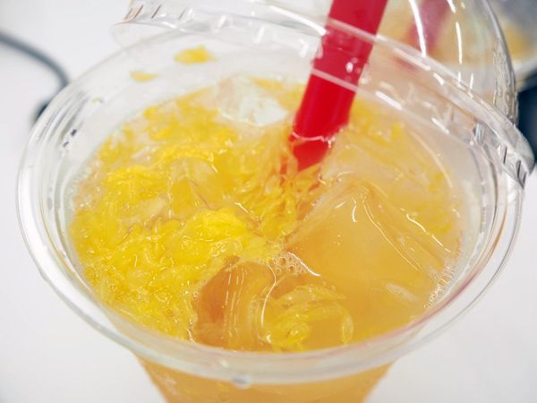 主役は、マンゴーとオレンジ。ごろっと入ったマンゴーの果肉と、つぶつぶとしたオレンジのさのう(果肉のつぶつぶとした部分)が入ることで、まるで“そのままフルーツを食べている”ような食感に。ストローを通して口に入った瞬間、果実のジューシーさと甘さ、そしてほのかな酸味がじゅわっと広がるのが特徴です。