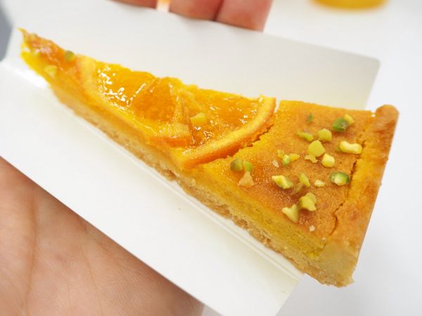 上にはスライスオレンジ、下にはねっとりとしたアルフォンソマンゴーのピューレを練りこんだ生地のタルトです。一口食べると、しっとりとした食感の中に、オレンジスライスのほろ苦さが感じられ、絶妙な味わい。さらに、上にちりばめられたピスタチオのグリーンが見た目にも華やか。夏の手土産としても喜ばれそうですね。