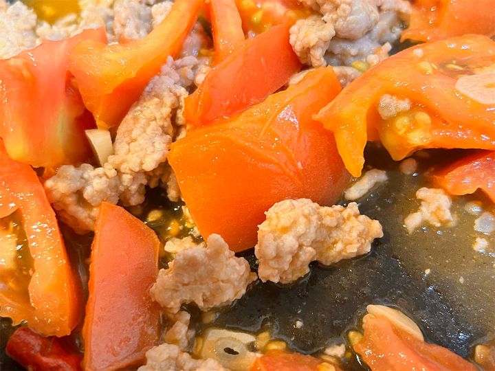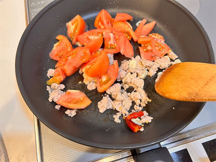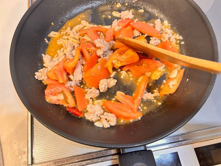 ひき肉の赤い色がなくなったら、1のトマトを加えます。