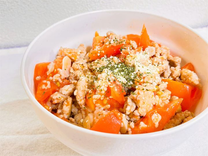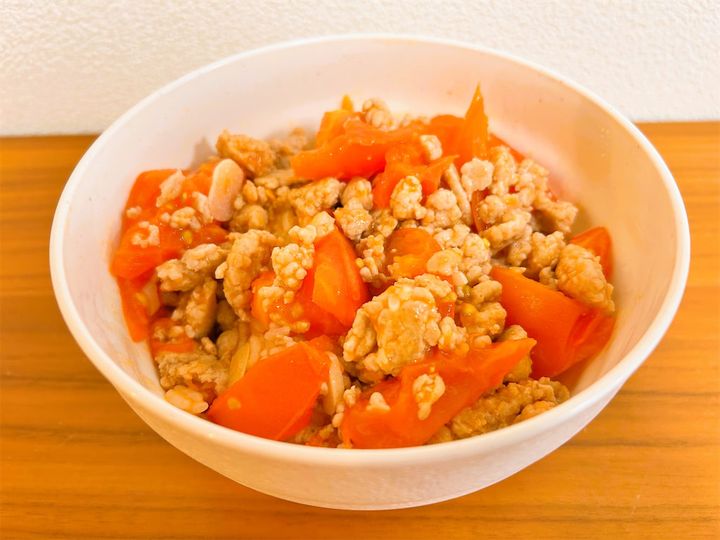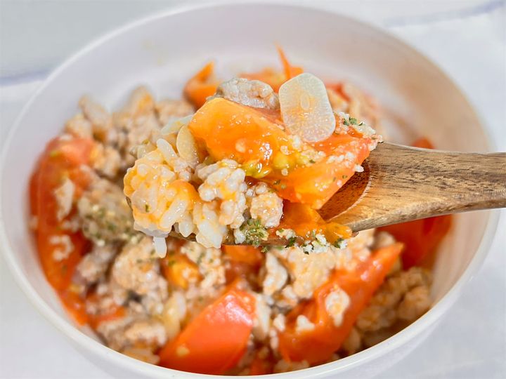 今回買ったトマト、ちょっと硬くて生では食べにくい…。どうしようかな〜と思って検索してみたところ、『料理研究家リュウジのバズレシピ』で「トマト丼」というレシピを発見!なんと、硬いトマトでも炒めればおいしくなるとのこと。しかも、ひき肉と合わせるだけでパパッと一品完成するそうなんです。これは試してみるしかない!というわけで、さっそく作ってみました。