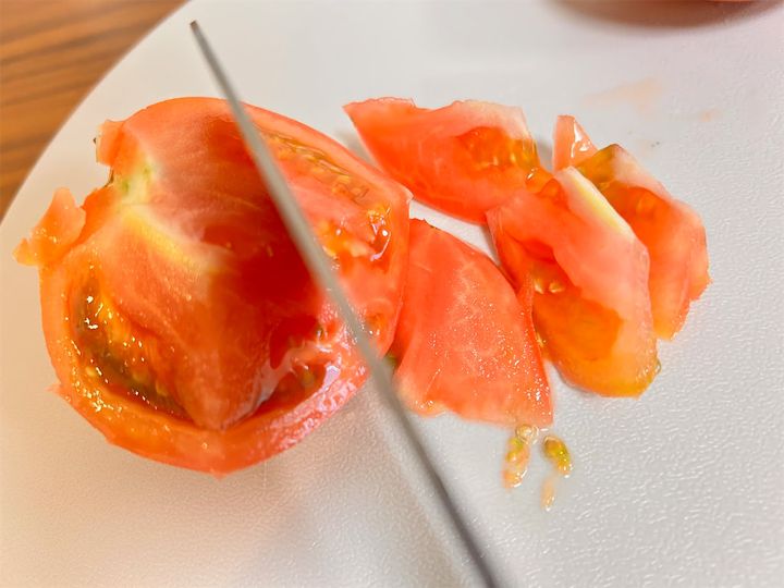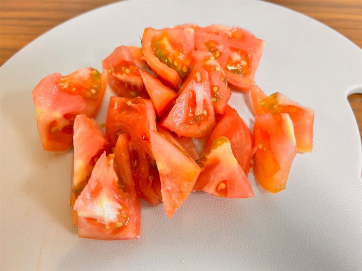 でも、仕上がりはとてもおいしくて、あえてかためのトマトを買ってまた作りたいと思える味でしたよ。