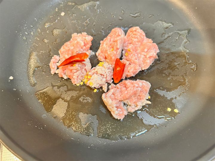 ひき肉の色が少し変わり始めたところで、鷹の爪を半分に千切って入れました。