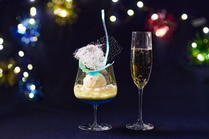 花火観賞中、シャンパンと「熱海海上花火大会」をイメージしたオリジナルパフェも味わえます。パフェは、相模湾をイメージした青いゼリー、花火玉を連想させるアイスクリーム、そして打ち上がる花火を飴で表現。見た目も華やかなパフェです。シャンパンやパフェとともに、優雅なひとときを。