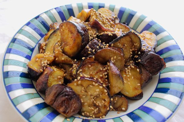 まるさん考案の「なすの甘酢炒め」が完成しました。なすに片栗粉をまぶしたのでたれの絡みがとても良く、ゴマもなすにしっかりとくっついています。