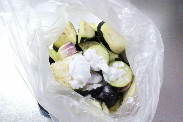 片栗粉が少量なので、今回はポリ袋になすと片栗粉入れてまぶすことに。