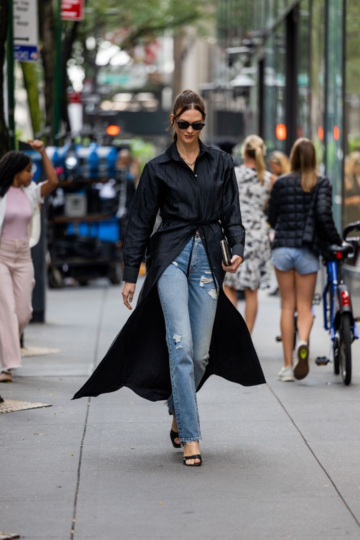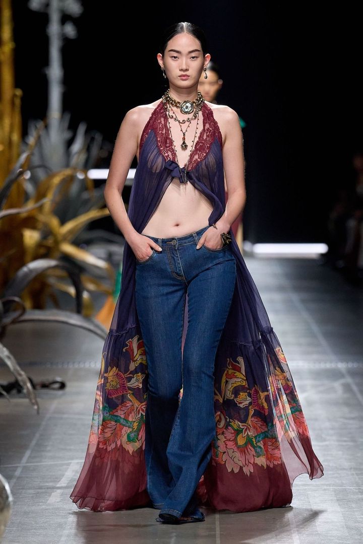ストリートでもファッショニスタたちが続々とこのトレンドを取り入れている。便利さと優雅さを兼ね備えたこのスタイルは、もはや“再燃”ではなく“復権”の域。特に暑さが続くこれからの季節には、ドレスやキモノ感覚で着られるロングトップスがまさに救世主だ。ボトムは、エトロのルックのようにスリムなデニムを合わせるのが鉄則。今回は、そんな“ロングブラウス×スリムジーンズ”の最旬バランスを、ファッショニスタたちのスタイルからひも解く。