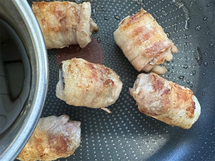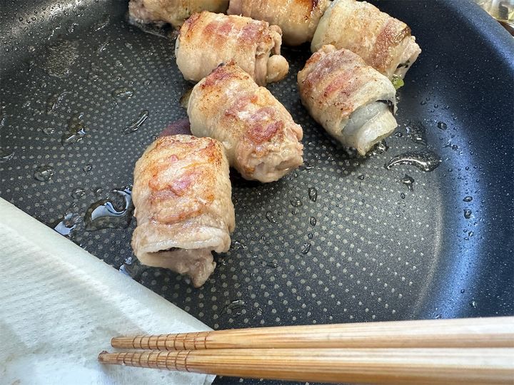 4. ときどき転がしながら焼き、肉に火が通ったら余分な油をキッチンペーパーで拭き取ります。