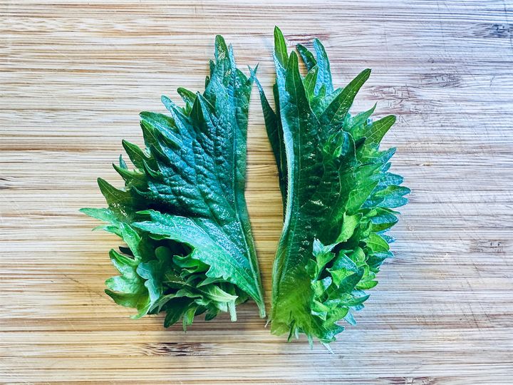 1. なすはヘタを切り落とし、縦8枚にスライスし、塩少々を振って約5分おいてしんなりしたら、キッチンぺーパーで水気をとります。青じそは、縦半分に切ります。