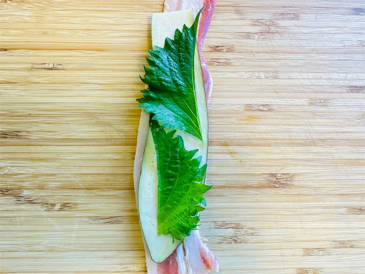 2. 豚肉を1枚広げ、なす、青じその順にのせて、下からクルクルと巻いていきます。