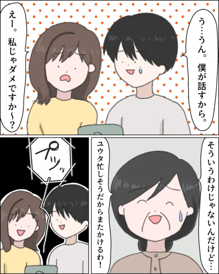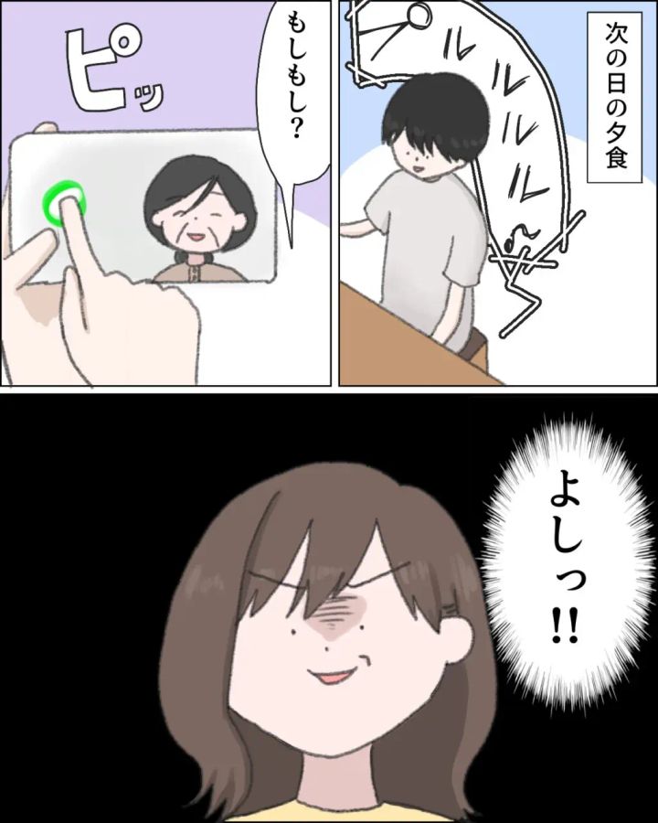 いつものように義母から電話がかかって来て、いつものようにテレビ電話で話そうとするユウタを見て、「よしっ!!」と呟く私。