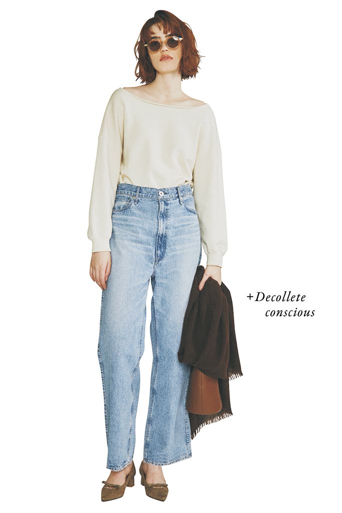 洗い加工が強めのラフなデニムに対し、トップスはデコルテコンシャスなスウェットをオン。広めに開いた鎖骨の見える首元でいつものスウェット+デニムをカジュアル以上へ。