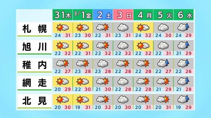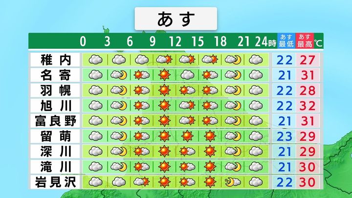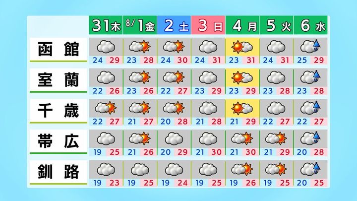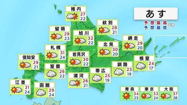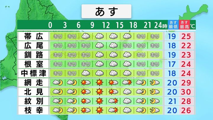 太平洋側は低い雲や霧がかかりますが、オホーツク海側は晴れるでしょう。最低気温は20度前後で涼しいでしょう。最高気温は釧路で23度ですが、北見は30度と暑くなります。