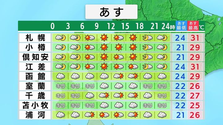 札幌周辺は晴れますが、室蘭や苫小牧は雲が広がり、朝晩は霧がかかるでしょう。札幌ではきょう30日(水)5日ぶりに真夏日になりましたが、あすも31度と真夏日予想です。熱中症や食品の取り扱いにも注意して下さい。