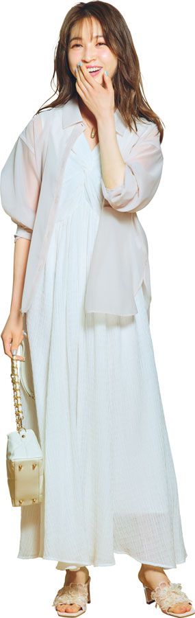 ワンピース¥24,200/CELFORD シャツ¥11,000/リランドチュール ネックレス¥50,600/ミチ ウィルウェイ(14 SHOWROOM) バッグ¥14,300/ダイアナ(ダイアナ 銀座本店) 靴¥9,900/オリエンタルトラフィック(ダブルエー)