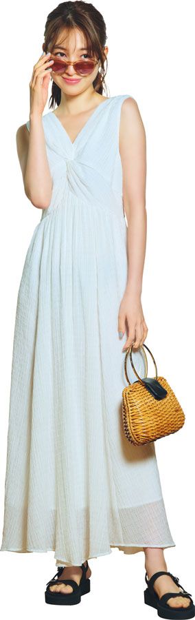 表面のシボ感が夏めく涼しげなニュアンス。夏の日差しの下で映える、ドラマチックな白のマキシ丈ワンピ。胸元のツイストデザインが、腰位置を高く見せてスタイルアップ♪