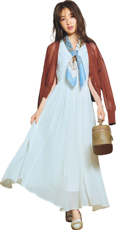 ワンピース¥24,200/CELFORD カーディガン¥7,491/NATURAL BEAUTY BASIC スカーフ¥8,910/アンタイトル バッグ¥2,990/神戸レタス 靴¥33,000/銀座かねまつ(銀座かねまつ6丁目本店)