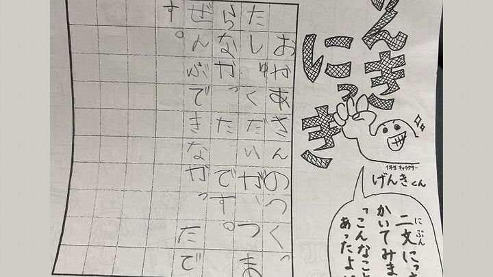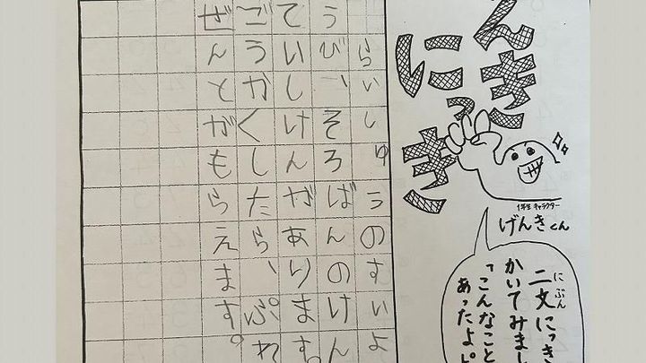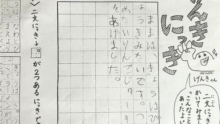 ひっくり返すとマス目が並んでいて、“二文にっきをかいてみましょう。『こんなことがあったよ』”と、毎日作文を書いて先生に提出するようになったのです。