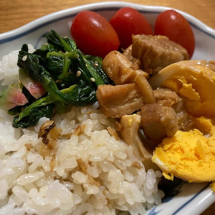 ご飯に豚肉、ほうれん草、ミニトマト、煮卵をのせて栄養満点!