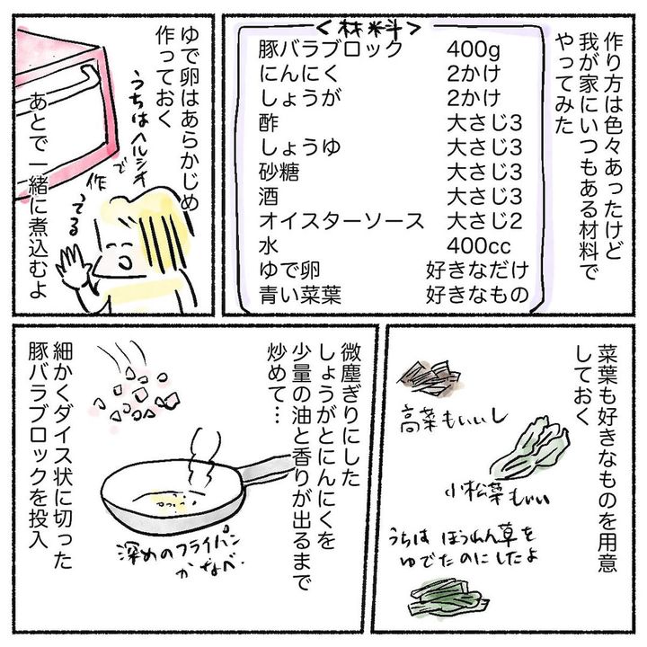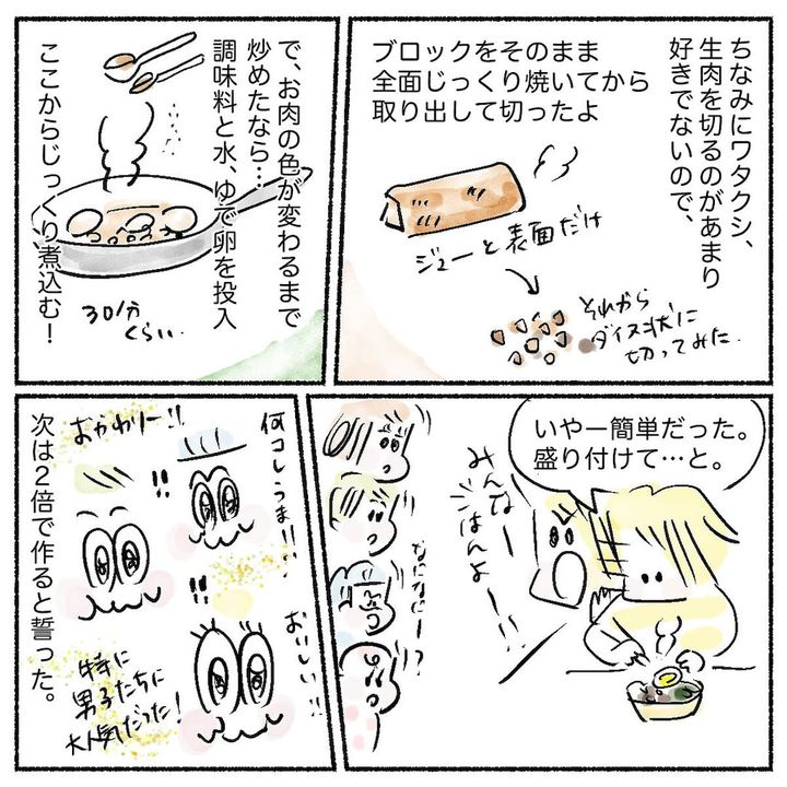 こんにちは!4児の母で漫画家兼公認会計士のAyumiです。先日スーパーで豚バラブロックをお得にゲットしまして。これを使って前から気になっていた「ルーローハン」にチャレンジしました。この料理、台湾の屋台飯と聞いたことがある程度で、作るのは難しそうと思っていたんですが…実は超簡単で大ヒットな出来栄えに!本格的な香辛料がなくても、おいしく作れちゃったお話です。詳しい作り方は漫画をご覧ください♪